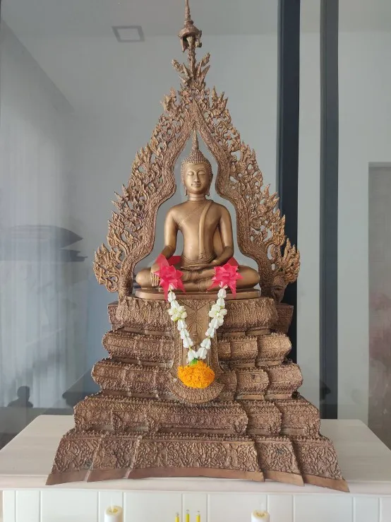 Standing at 33 inches, this statue is not just a spiritual object; it is a work of art, a monument of faith, and a beacon of royal and religious synergy. Its imposing height allows it to be a central figure in any space, creating a focal point for meditation, prayer, and daily reflection. The detailed craftsmanship, combined with the sacredness of its origin and the royal blessing it received, makes this Phra Phuttha Chinnasi statue a truly unique and invaluable piece. It is not merely a symbol of devotion, but a physical manifestation of the merging of Thai royalty and Buddhist spirituality, destined to bring blessings and harmony to all who revere it.